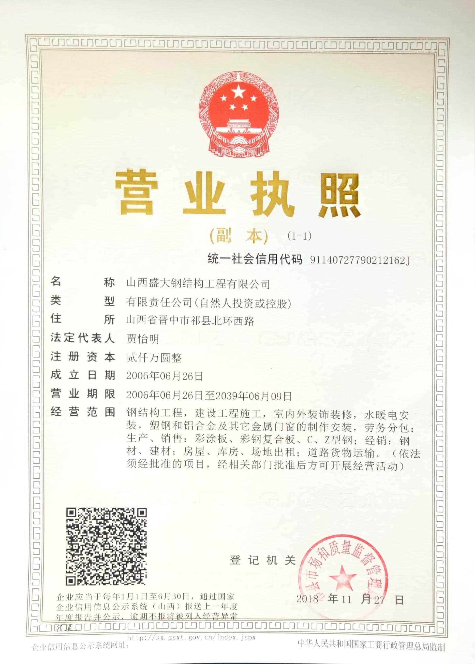 山西盛大鋼結(jié)構(gòu)工程有限公司 山西盛大鋼結(jié)構(gòu)工程有限公司成立于1996年5月,坐落于國(guó)家歷史文化名城-山西祁縣。廠區(qū)占地面積110畝,建筑面積3萬(wàn)余平方米,一廠位于祁縣晉商西街85號(hào),二廠位于祁縣省級(jí)開(kāi)發(fā)區(qū)208國(guó)道。是一家以研發(fā)、銷售、制造和施工于一體的大型鋼結(jié)構(gòu)工程企業(yè),公司具有鋼結(jié)構(gòu)工程專業(yè)承包貳級(jí)資質(zhì)、建筑工程施工總承包貳級(jí)資質(zhì)。擁有年生產(chǎn)鋼結(jié)構(gòu)5萬(wàn)余噸,巖棉板100萬(wàn)平方米,彩鋼瓦200萬(wàn)平方米,鋼筋桁架樓承板50萬(wàn)平方米的生產(chǎn)能力。 more +